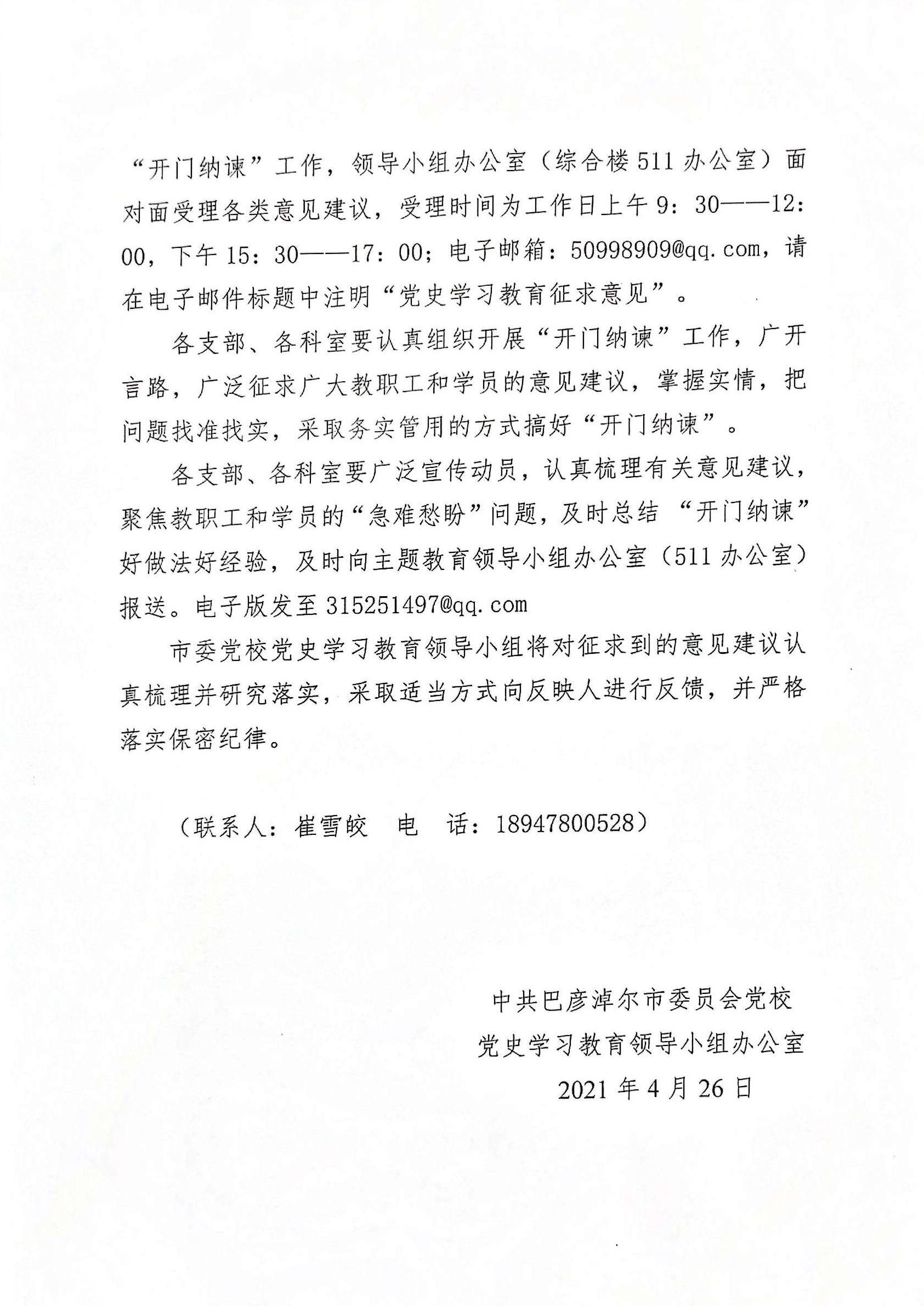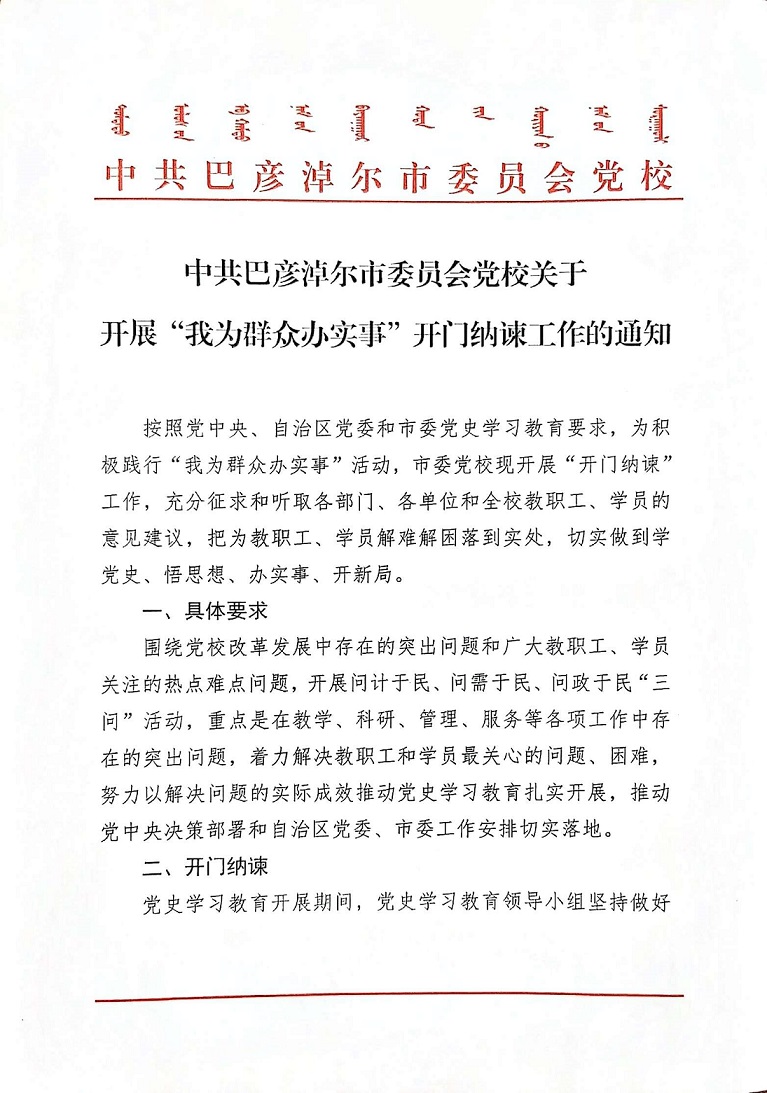中共巴彦淖尔市委员会党校关于展“我为群众办实事”开门纳谏工作的通知