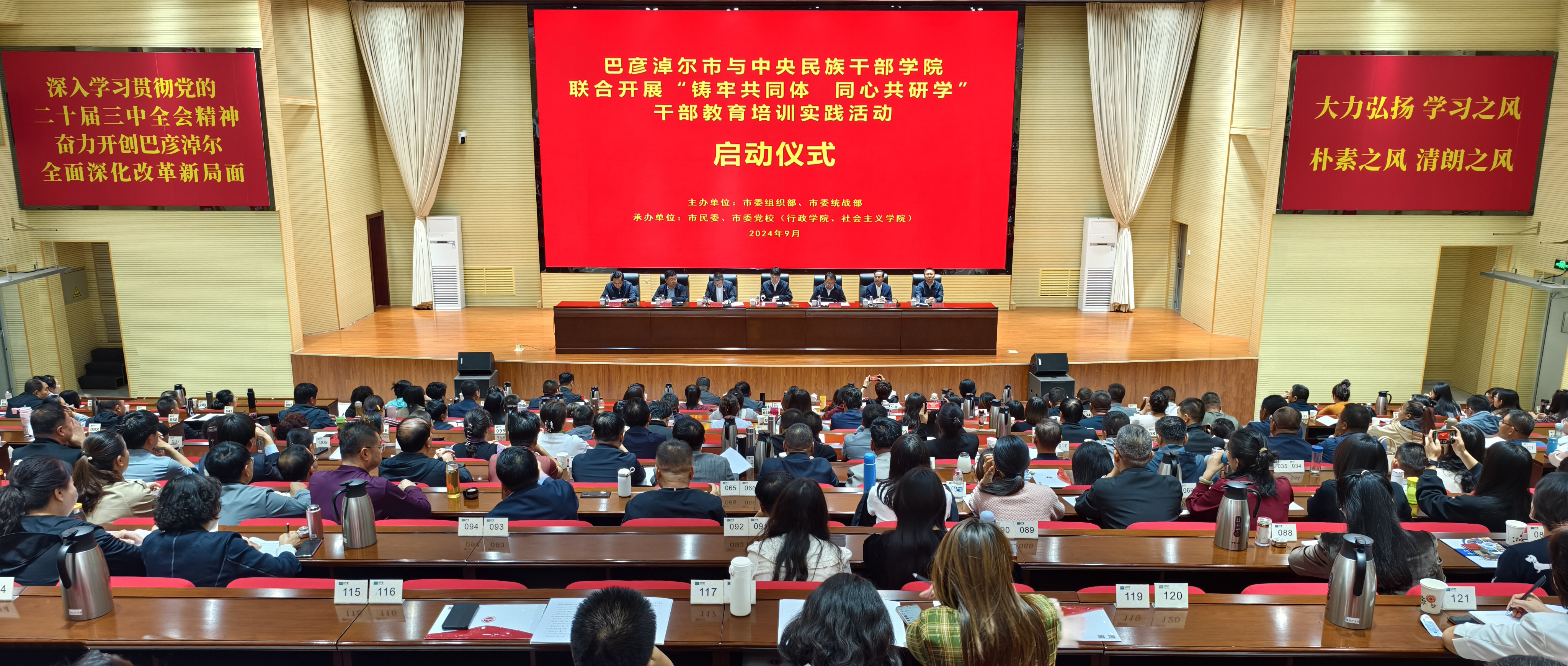 为深入学习贯彻党的二十届三中全会精神,进一步贯彻落实中央民族干部学院与巴彦淖尔市战略合作协议精神,9月26日,巴彦淖尔市与中央民族干部学院联合开展“铸牢共同体 同心共研学”干部教育培训实践活动启动仪式在巴彦淖尔市委党校举行。活动由巴彦淖尔市委组织部、统战部主办,市民委、党校具体承办。实践活动启动仪式由市委常委、统战部部长、五原县委书记阿其图主持,市委常委、政府副市长边旭东,中央民族干部学院党委委员、总会计师任涛出席了会议并致辞。双方表示,在前期合作的基础上,将不断增强做好铸牢中华民族共同体意识干部教育培训工作的责任感和使命感,努力做好新时代民族工作。